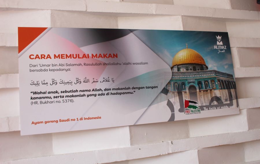 Hal itu bisa dilihat di poster-poster dan hiasan yang disematkan di dinding restorannya. Juga ada komitmen alokasi 5% keuntungan setiap outlet Almas Fried Chicken yang disumbangkan untuk saudara-saudara kita di Palestina.